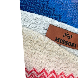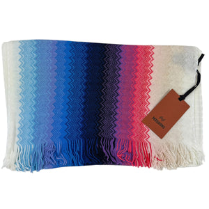 Women collection: Authentic Missoni scarf, white pink blue (litle purple) zigzag stripes, soft wool fabrics, fringe, made in Italy. Genuine Missoni scarves at outlet prices, women collection, quality designer shawls, made in Italy.